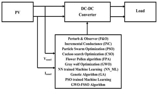 A charge controller algorithm called MPPT is used to extract the maximum power from a PV module in specific circumstances. The maximum power fluctuates with variations in irradiation from the sun, outside temperatures, and solar cell temperature. The PV cell absorbs light uniformly when there is coherent irradiance, irrespective of total radiation or total shadowing. When the sun’s energy hits the PV panel in an uneven manner, partial shadowing happens [32]. The block diagram of the MPPT-based solar PV system reported in this work is depicted in Figure 2.