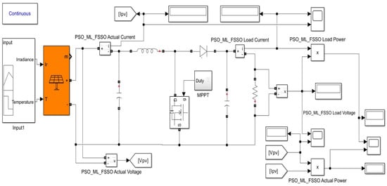 The PWM generator is then fed the MOSFET switching device. The variation of the PWM was continuously adjusted and designed to extract the maximum power from the PV panel. Here, a DC–DC boost converter was employed to keep track of the solar PV array’s maximum output. The converter has a resistive load of 2 Ω, a MOSFET power device that switches at a 20 kHz frequency with a controlled duty cycle, an inductor of 0.045875 × 10−3 H, and a capacitor of 0.259725 F.