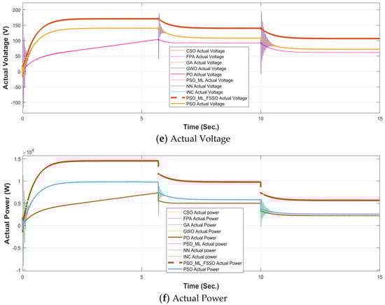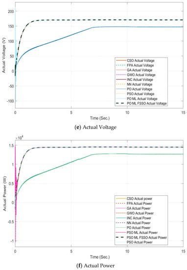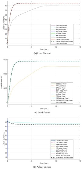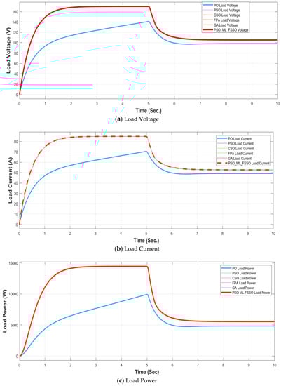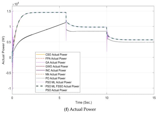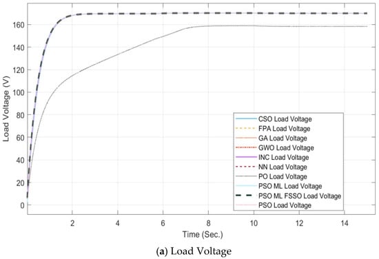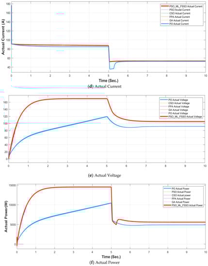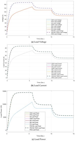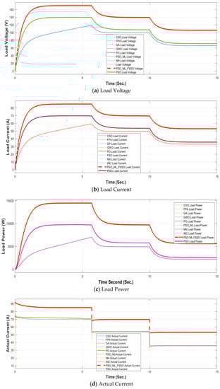 A PV module was subject to a partial shading condition where irradiation levels are not uniform over the PV module. The model presented in this work consists of 72 cells, which are divided into three equal parts (i.e., each part consists of 24 cells) and connected in series. Three different cases were considered for a partial shading condition for the PV system for 800 W/m2, 600 W/m2, and 400 W/m2 irradiation. To show the effectiveness of partial shading conditions, a comparison between a partial shading condition and without partial shading condition (i.e., 1000 W/m2 irradiation and 25 °C temperature) was also considered in this work. The results obtained for the above cases are depicted in Figure 8. The performance of the partial shading condition for the three different cases is summarized in Table 12. From the tables, it is clear that proposed hybrid algorithm increased the efficiency of the PV system and outperformed the other MPPT algorithms in terms of performance parameters like peak overshoot, setting time, rise time, etc.