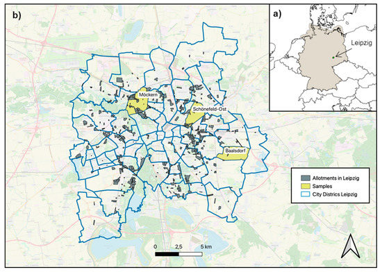 (a) The location of Leipzig in Germany, and (b) the location of allotments in Leipzig and the selected city districts Möckern, Schönefeld-Ost, and Baalsdorf (own representation in QGIS 3.28. Data source: Open Street Maps, 2023).