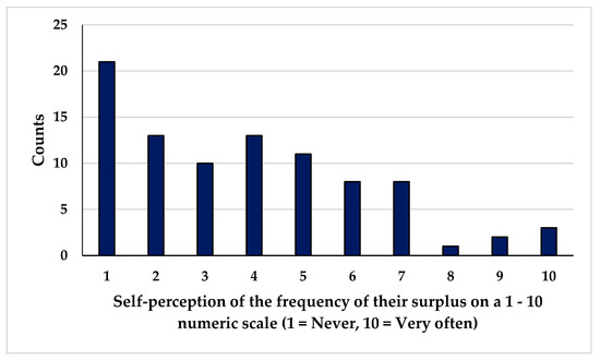 Participant’s estimation of the frequency of their own surplus on a 1–10 numeric scale (1 = Never, 10 = Very often (Question: “How often do you harvest more than you consume?”, translated from the questionnaire in German).