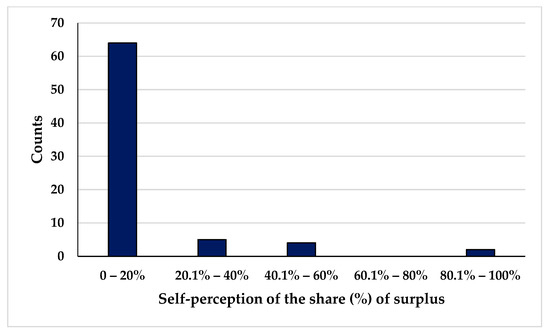 The self-perceived share of the production surplus (Figure 4) shows that the majority of respondents think that they have a surplus of between 0% and 20%. The mean value is 11.2%. The median is even at 5%.