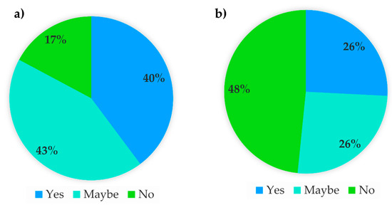 The most important question was related to the question of whether respondents would generally find a system useful that organizes the distribution of surplus harvests to potential consumers if selling garden products would be allowed. About 43% of the respondents answered with “maybe”, 40% with “yes”, and 17% with “no”. Taking together those who answered “yes” and “maybe” forms a clear majority of 83% (Figure 5a). About 48% of the respondents answered “no” regarding the question of whether selling the products from their garden would still be attractive if they could only earn a small amount of money, while 26% answered with “maybe” and another 26% with “yes” (Figure 5b). Those who can imagine potentially selling garden products (if it would be allowed) thus form a slight majority of 52%. Four out of ninety-three respondents have even sold products from their own garden, although at least one respondent referred to the time and distribution system of the former German Democratic Republic (as emerged from the personal communication and from a note on the questionnaire).