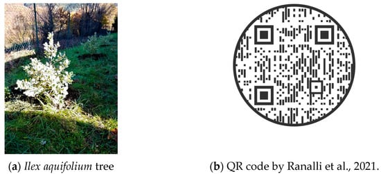 (a) Example of an I. aquifolium (var. argentea marginata) planted; (b) QR code traceability between environmental impact of manuscript [1] and mitigation action by I. aquifolium plantation.