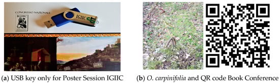 (a) USB key including only posters presented at the conference Lo Stato dell’Arte20 (IGIIC, 13–15 October 2022, Campobasso, Italy) [40]; (b) QR code traceability between environmental impact of abstract book (conference IGIIC) and mitigation action by O. carpinifolia plantation.
