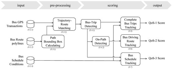 Due to these issues, data analytics on GPS data and other datasets is mainly employed to determine the QoS scores. In this case, our method provides four phases, input, preprocessing, scoring, and output, as depicted in Figure 1. Input data are the GPS transaction of buses, the polyline of every bus route, and the schedule conditions of all bus routes. To work with GPS data, the techniques of GPS coordinates rounding is adopted at the preprocessing phase. Then, bus trips and metadata are calculated in order to measure three QoS scoring functions. Our work resulted in the QoS score of each bus route for the three months of the last quarter of 2021, and found that there was room for improvement in the sustainability of bus transportation services.