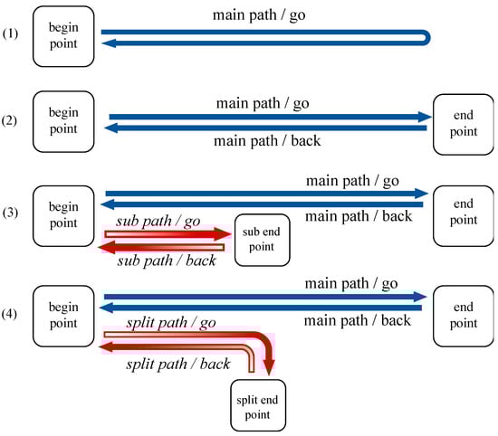Behaviors of bus routes and paths in Thailand. (1) A loop path. (2) A two-direction path. (3) A main path and subpath. (4) A main path and split path.