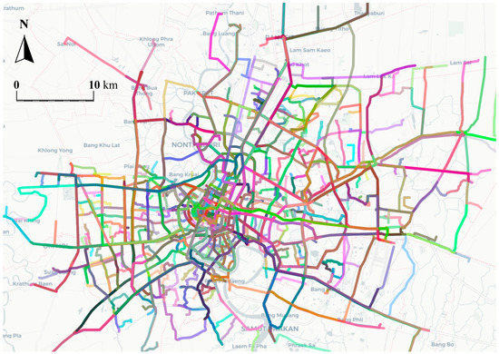 The updated dataset of bus route polyline data from 2021 for Bangkok and its metropolitan area has 1085 entries, including 454 routes, as shown in Figure 3; each route has 2.4 paths, 0.7 split paths, and 0.2 subpaths on average.