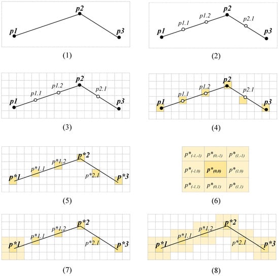 Steps to construct GPS rounding boxes. (1) An original polyline. (2) Inner points between corner points. (3) The construction of a rounding box grid. (4) Mapping a point into its rounding box. (5) The representation of rounding box of each point with a star symbol. (6) A guideline for creating the first-layer neighbors of a given rounding box. (7) The neighbors of the first rounding box. (8) All neighbors of all rounding boxes.
