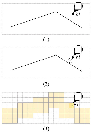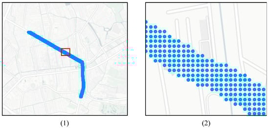To create a map match between GPS data and a path, in general, vector techniques such as the distance from the point to the perpendicular point of the curved surface, and path similarity, provide high performance and high complexity. Several studies, such as [17,18,19,20] recommended the rasterization of the vector for working with a large amount of data. Thus, we applied the concepts of rounding boxes from [17] in order to detect bus trips. In this section, GPS coordinates, path rounding boxes, and trajectory route matching are described.