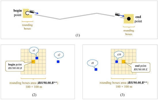 Since GPS coordinates are a floating point number, it consumes processing time to find a nearby location. According to [17], a rounding box of a coordinate can be used as the reference of the same location. For example, the three-digit rounding boxes of (13.65495, 100.22424) and (13.65477, 100.22410) are (13.655, 100.224) and (13.655, 100.224), which are considered as approximately the same location. Thus, a path, which is polylines, can be structured by rounding boxes using the following four steps, together with the demonstration in Figure 4.
