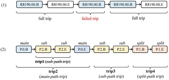 The first row in the table indicates that the trip was made by bus “4d43e028” on path R8190.00, which is the main path of route R8190, between 10:10 and 12:12 on 1 October 2022, and was a full trip. In addition, some trips, such as 3, 6, and 11, were considered failed trips, because they did not pass through the end points of their paths.