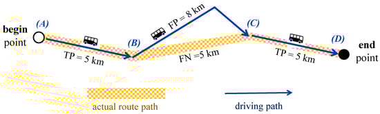 When a trip is detected, an on-path driving detection is also calculated. The calculation needs to follow the GPS data of each trip point by point to check the distance on a route path and the distance outside of the route path. To do this, a true-positive, false-positive, and false-negative are verified, as demonstrated in Figure 9, and the Jaccard index is determined.