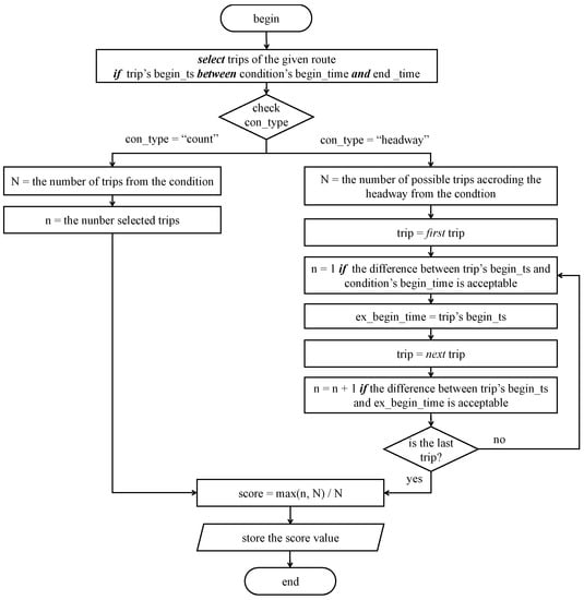 Lastly, the QoS-3 score is evaluated using condition data in Table 4 and trip data in Table 6. The first step is to select trips from a path and begin time that satisfy the given conditions. Next, the conditions “count” and “headway” are used, and for each condition the steps in the flowchart in Figure 10 are performed.