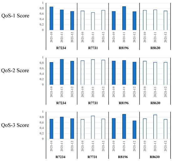 The GPS transaction dataset of buses between 1 October 2021 and 31 December 2021 was analyzed. There were 709,182,747 transactions in total, including 454 bus routes and 4418 buses. The route numbers were masked due to privacy constraints—for example, R7234, R7731, R8196, R8630, etc. After calculating with our approach from the previous section, the daily results of QoS-1, QoS-2, and QoS-3 were as given in Table 8. The table demonstrates examples of 12 entries from the actual 92 entries of route R7234. After that, the QoS scores of each route were grouped by month and reported in Table 9. In addition, the report from Table 9 can be visualized into charts as in Figure 11. There are three charts reporting QoS-1, 2, and 3, and each is grouped by a bus route, where every group displays a QoS score ordered by month.