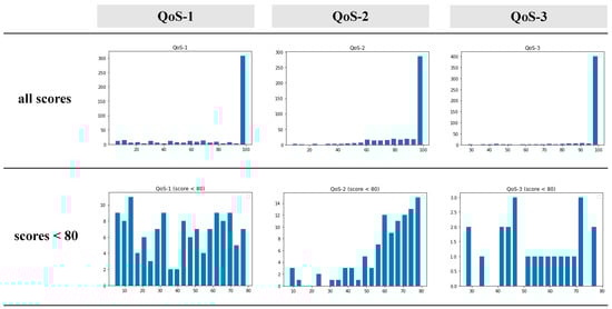 Histograms of QoS scores. Each column is the QoS score; the first row shows histograms of all scores, and the second row displays histograms of scores below 80.