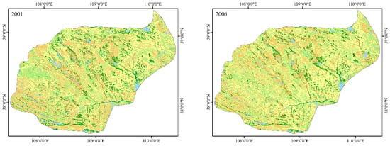 China is one of the countries with the largest desert areas and the fastest speed of desertification in the world. Sandstorm disasters frequently occur and land desertification causes considerable economic losses [30]. The Mu Us Sandy Land is one of the four major sandy-land areas in China, which is located at the junction of arid and semi-arid areas. It is a typical agricultural–pastoral ecotone formed by both the natural environment and human activities. To a certain extent, the desertification process occurring in the Mu Us Sandy Land Ecological Function Reserve represents the desertification characteristics of arid and semi-arid areas [31]. Following years of management, the Mu Us Sandy Land Ecological Function Reserve has experienced significant improvements, and the desertification area has also been considerably reduced. However, the ecological environment in this region remains fragile and sensitive, and the results of governance are still unstable. In order to prevent the phenomenon of desertification from recurring, the effective monitoring and assessment of land desertification processes needs to be continuously conducted.