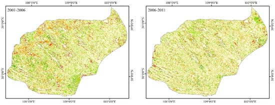 According to the spatial distribution of desertified land (Figure 6), the overall area in the study location showed a trend of expanding first and then decreasing. Moderate desertification covers the most extensive areas. From 2001 to 2021, the eastern and southeastern regions of the Mu Us Desert, which are close to the water, have significantly decreased in terms of desertification, and the non- and mild-desertification areas have remarkably increased, while there still remain some moderate- and severe-desertification areas located in the western Gobi Desert.
