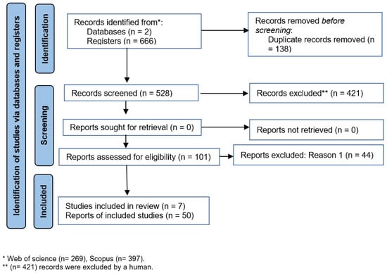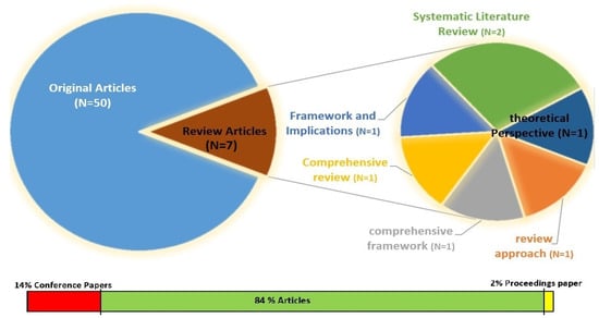 Figure 1 is a PRISMA flow diagram which shows the process of data collecting [62] (check PRISMA check list in the Supplementary Materials). This began with the initial search to extract the related data from the selected databases (Scopus and WoS), and ended with the final collection of articles, after applying multiple screening and refinement steps, as a used data set that can be considered compatible with the research goals [2]. In the end, a total of 57 documents were eligible for analysis in this study.