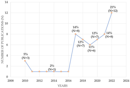 The emergence of publications on GSCM, in general, started separately from the hotel industry in 1990 [33]. However, for the case of the hotel industry, Figure 2 shows that the emergence of publications on GSCM in hotels started in 2010, but did not receive much attention until 2017. This could be due to two main reasons, the first of which is the setting of SDGs (sustainable development goals) by UNWTO in 2016, and the second of which is the announcement of tourism SDGs by UNWTO in 2017, which was the international year of sustainable tourism for development. Additionally, the use of GSCM in the hotel industry began to attract noticeable attention by the beginning of 2020, which is because of critical impact COVID-19 had on most aspects of life, and especially on supply chains around the world and the tourism industry, which includes hotels. Figure 2 shows the ascending trend starting from 2019 (N = 6) to 2022 (N = 12), with a 100% growth rate. Moreover, the number of publications (N) reached its peak in 2022, with a total of twelve publications, even though this figure does not include the final month’s articles from this year (2022).