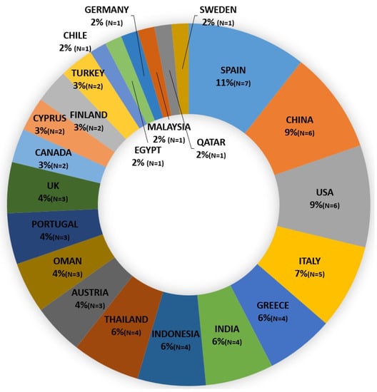 Additionally, the scientific production regarding GSCM in the hotel industry was produced by 22 countries, divided across five continents. European countries ranked first with 10 publications. Additionally, there were 8 for Asia, 2 for North America, and 1 for each of Africa and South America. This reflects the diversity in the participation, and also refers to the importance of the subject and the different points of view it was subjected to. Figure 3 shows the participating country in GSCM in the hotel industry literature and the participation percentage of each country.