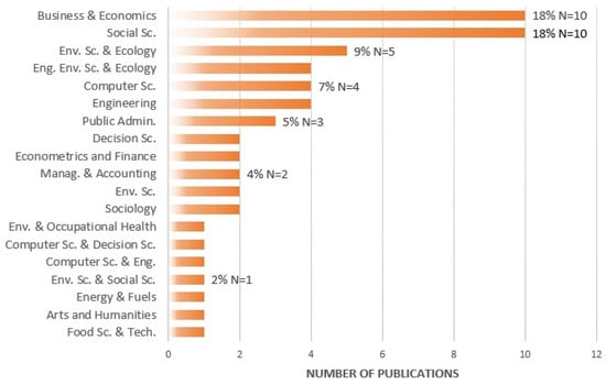The field of GSCM in the hotel industry is very wide. It is related to many fields of study due to the diversity of relations that GSCM creates with stakeholders and the variety of practices and departments related to GSCM. Figure 5 presents the main field of studies which were included in the analyzed articles, showing how the GSCM in the hotel industry has not been discussed, having received attention mainly from the perspective of management and administration. In fact, it has been discussed and related to various fields, such as economics, environmental sciences, social sciences, computer sciences, engineering, environmental engineering, food sciences, and many more. This also highlights the different academic perspectives on how GSCM contributes to the hotel industry, providing hints for the future direction of scientific research in this field.