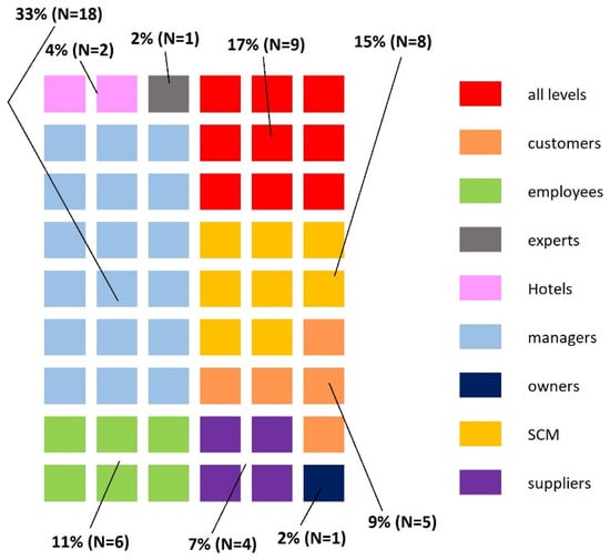 This analysis aimed to establish the main groups which the GSCM literature focused on in relation to the hotel industry. This is very important to better understanding the different relations of GSCM in hotels and how they work, in addition to knowing which main stakeholders the literature has focused on up to today and what segment of stakeholders should receive greater attention in future studies. In general, the analysis revealed that the literature discussed various segments of samples. A proportion of 15% of articles discuss GSCM, particularly in the hotel industry. Furthermore, 46% of the case studies discussed the segment of internal stakeholders which receive the largest proportion of attention in the academic field: GSCM and managers came first, followed by GSCM and employees, and the GSCM and owners, discussed in 33%, 11%, and 2% of published articles, respectively. Figure 6 illustrates the various groups of samples and segments in the hotel industry concerning GSCM, and the percentages of each one as it was in the scientific literature.