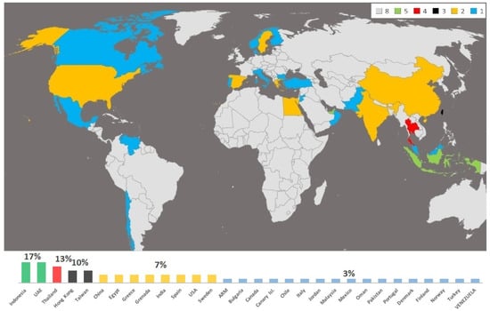 Distribution of the case studies in terms of published articles by country.