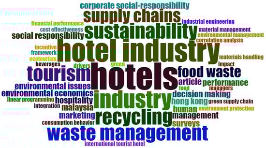 The word cloud map presents the most frequent keywords in the collected literature which discusses GSCM in the hotel industry. The size of the keyword reflects its frequency of use. For this study, the most frequently occurring keywords were the hotel industry, hotel, supply chains, recycle, waste management, sustainability, food waste, environment, and many more (see Figure 8). All these words are related to GSCM in the hotel industry. For example, waste management word is one of the GSCM’s main practices, and sometimes it is a department of GSCM.