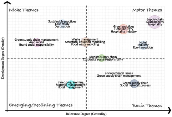 In addition to the word cloud, keywords in the literature on GSCM in the hotel industry were analyzed using a thematic map. This way of visualization analysis summarizes results which can be read based on two main factors: the size of a keyword spot, and the location of those spots on the map. The size refers to the frequency level of each keyword, whereas location reflects the occurrence of keywords based on two dimensions: relevance degree (centrality) and development degree (density) [64].