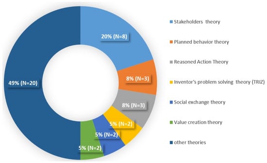 Generally, each study should be based on a scientific theory to discuss its idea in a more convincing way and with a solid base. The literature reviewed in this study, which analyzed GSCM in the hotel industry, used 26 different scientific theories. The diversity of the theories used conveys the widespread connection between the subject of GSCM in the hotel industry and a variety of scientific theories and definitions. The most commonly used theories (see Figure 11) in the literature were the stakeholders theory, which reflects the fact that GSCM is related to multiple parties, in addition to planned behavior theory, reasoned action theory, inventor’s problem-solving theory (TRIZ), social exchange theory, value creation theory, etc.