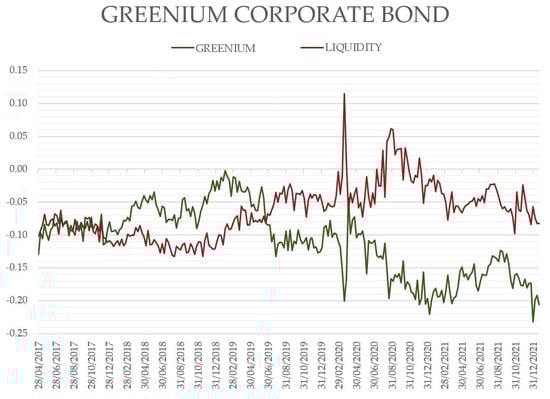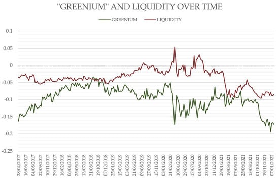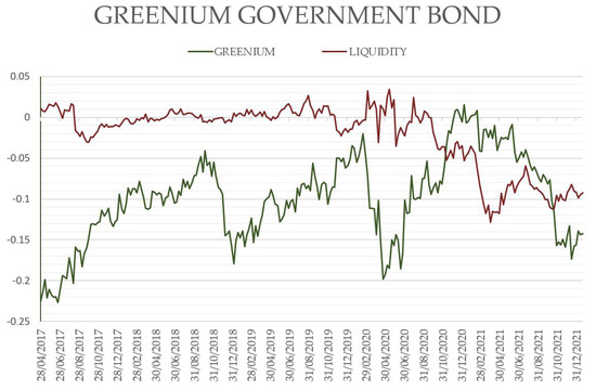Table 3) clearly show the presence of a statistically significant greenium with a value of −13 bps, evident in the model constant. The independent variable of the residual liquidity appears to be close to 0 and not statistically significant. At the same time, the above data show a correct choice of bonds and an effective matching procedure for the sampled bonds, as in this case, data highlight that liquidity is not the determinant of the yield differential itself, and, therefore, of the greenium.