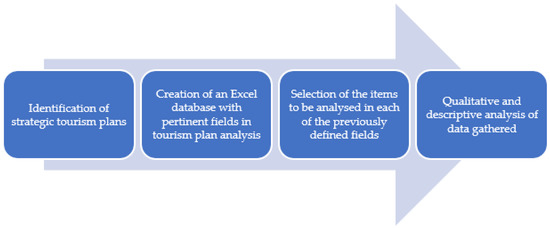 A case study can often imply a diverse range of methods [18]. However, document analysis is particularly applicable to case studies [19] since it can produce rich descriptions of a phenomenon or programme. According to Liasidou, “document analysis helps in understanding and identifying what was said or written versus what was applied to shed light on the historic development of tourism” [20] (p. 77). Additionally, these documents are not only an essential source of information concerning the reaction and perspectives of the government but also the various stakeholders as the main actors in the tourism industry [21,22]. In other words, these documents also reflect the role of successful networks and cooperation with different stakeholders as a vital part of the development of such policies [23]. Therefore, in order to analyse the content and structure of national tourism plans that have been implemented in Portugal since the beginning of the 21st century and that have guided national strategy throughout the new millennium, it was developed a methodological procedure that comprises four interrelated stages (see Figure 1).