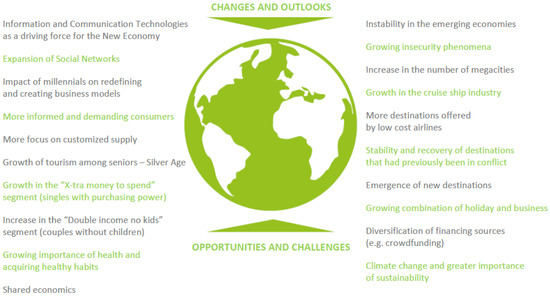 In Tourism Strategy 2027, the analysis and diagnosis is presented in an original way, divided into two chapters. First comes the chapter “Where are we?—The performance of tourism in Portugal”, where information about the evolution of tourism in the decade 2005–2015 is presented. Additionally, in this chapter, the presentation of “Tourism today—2016” is made with reference to current data (for the time of construction of the plan) and ends with the presentation of a SWOT analysis, where “positive and negative elements of the tourism value chain in Portugal, over the last decade”, are stated [32] (pp. 41–42). The next chapter, “Changes, Outlooks and Challenges”, is the culmination of the analysis of the tourism sector and suggests some elements that will be important for the definition of the strategy (see Figure 3), which is the next phase of the plan.