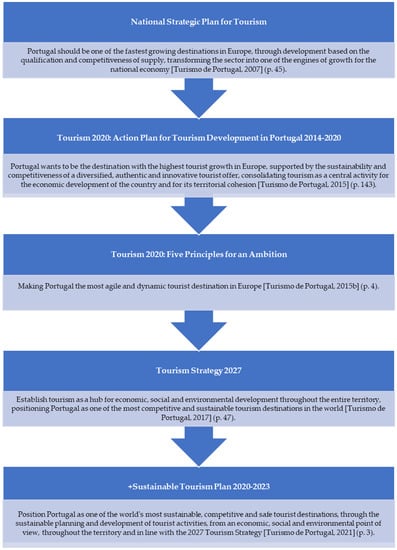 To talk about the history of tourism planning in Portugal, it is not necessary to go back a long way. The first strategic plan specifically dedicated to the tourism sector was created only at the end of the 1980s—the National Tourism Plan—and was implemented between 1986 and 1989. This document aimed to affirm tourism as a strategic sector for the revival of the Portuguese economy and sought to eliminate existing imbalances. The main topics addressed in this pioneering plan were tourism planning, spa tourism animation, administrative structure, training of human resources, investments, and tourism promotion [28].