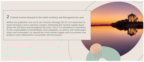 The document that is currently in force is the Tourism Strategy 2027, published in 2017. This plan “is based on a long-term vision, combined with short-term action, allowing for more strategic action in the present and being part of the future European support framework 2021–2027.” [32] (p. 12). There are five strategic axes that guide this document, which are: (1) valuing the territory; (2) boosting the economy; (3) enhancing knowledge; (4) generating networks and connectivity; and (5) promoting Portugal. In this document, the national commitment to sustainability issues was already clear, but it became more evident during the period of the COVID-19 pandemic [32].