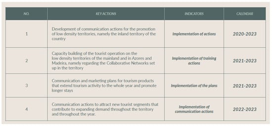In Tourism Strategy 2027, the action plan is once again included in the chapter titled “Implementation”. The following explanation is given in the document: “The present chapter lists the types of priority projects for developing tourism in the country as a whole and in the regions in particular, thereby fulfilling its role as the short/medium-term strategic guideline for Tourism Strategy 2027” [32] (p. 59). This description fits the definition of an action plan given by Alves [24]. In the document’s following pages, tables are presented with the description of the priority projects; however, there is no timetable for the actions nor the indicators that will allow the assessment of the correct implementation of the projects.