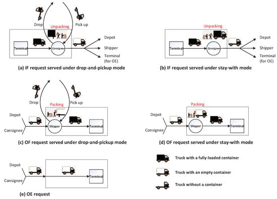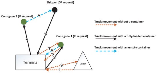 Note that a finish-to-start temporal dependency exists between the two nodes of an IF/OF request. Moreover, a truck can visit a depot node if and only if the depot node has already been visited by a truck. Temporal dependency constraints like these allow a further reduction of time windows for some nodes using the following pairwise reduction technique. Specifically, assume that two nodes i and j are connected with temporal dependency constraint and quantifies the required time gap between them; we can tighten the time window of node i to [, min] and the time window of node j to [max, ].