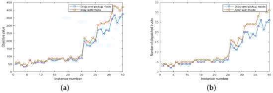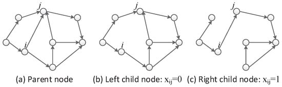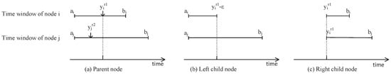 There could be massive labels during the extension. In order to obtain an efficient labeling setting algorithm, a dominance rule must be introduced to eliminate redundant partial paths whose extension will not lead to an optimal solution. For any two labels and at the same node i, label dominates label if the following conditions are satisfied. The conditions include: (1) ; (2) ; (3) ; (4) and any node that can be reached after without violating time-related constraints can also be reached after , earlier or at the same time.