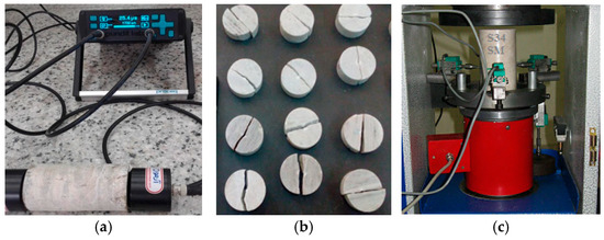 Example samples for PWV, PLI, and UCS tests: (a) device for measuring PWV, (b) example samples after PLI test, and (c) sample under UCS test.