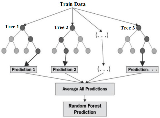 The random forest method is one of the ensemble methods. In these methods, the model chosen for classification or regression is a combination of several models. Figure 2 shows the idea of the random forest algorithm. In this approach, each model issues its vote and the final result about the value is issued based on these votes [22,23,52]. The general principles of group training techniques are based on the assumption that their accuracy is higher than other training algorithms [53]. On the other hand, the accuracy of combined methods is higher than the accuracy of its components [53]. The RFA method has also been used in rock mechanics in recent years [20]. In the RFA method, the models used in the combined method, which are all of the decision tree type, form a forest. Each of the decision trees is made using a random selection of special attributes in each node to determine the branching. In other words, each tree is built based on the values of a random vector. These values have the identical scattering for all trees in the forest and are sampled independently. For classification, each tree issues its vote, and the final result is determined by the majority vote [54]. The number of trees and the number of chosen variables in each node are important parameters in the RFA [55]. In this method, by replacing the information every sampling time, some information is never sampled, and other data may be sampled several times. In other words, some input data for some trees will be out of the bag, that is, they will not participate in the creation of some trees. These data have the function of an internal validator for each tree, which is performed by estimating the out-of-bag error. If the out-of-bag data itself is predicted through trees, there will be an error for these predictions, and the average of these errors is called the out-of-bag error. This error indicates the influence of the unselected samples on the error rate of the final result of the random forest [56].