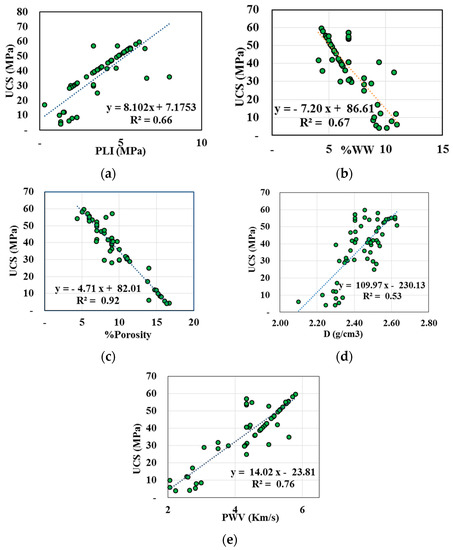 Figure 3 shows the effect of variables on the UCS. There is a reasonable tendency among these characteristics. The UCS decreases with increasing WW and porosity. This Figure shows that porosity has the highest effect on the UCS. Numerous studies have reported linear relationships with high accuracy between the point load index (PLI) and UCS [8,30]. The results of the relationship between PVW and UCS show that PWV displays a high accuracy to estimate UCS (Figure 3).