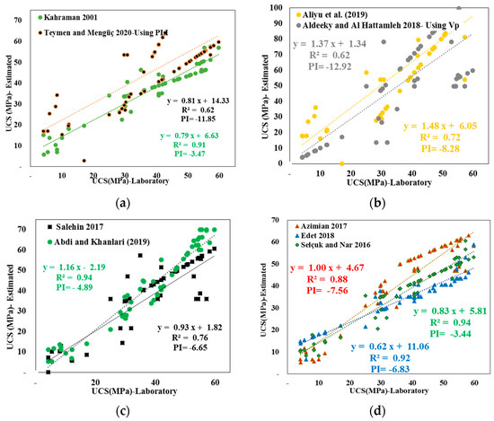 Figure 4 displays the data scattering and the precision of correlation using PI and R2. The results revealed that there is good compatibility between actual UCS and the estimated one using previous studies (Figure 4). A performance index (PI) was introduced by Yagiz et al. [85] for evaluating empirical equations and models. The value of this index is equal to two in the best case, and the lower it is, the lower the relationship performance. As can be seen, although the correlation coefficient is high, the performance index is negative, which indicates the poor performance of the previous researchers’ relationships in estimating the UCS of the studied rocks (Figure 4). For this reason, various researchers have emphasized that empirical relationships should be determined for each region [85].
