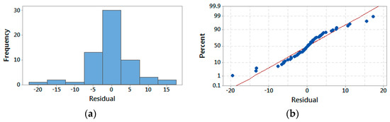 Normal state of the residues of model 18 (a) histogram of residuals, and (b) normal probability plot.