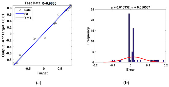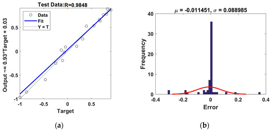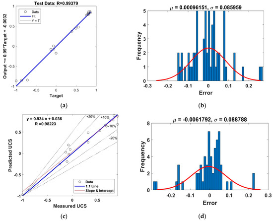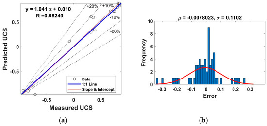 The error histogram and predicted and estimated UCS relationship with the optimal function (RBF function) are presented in Figure 11.