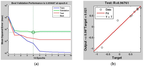The FMP−ANN results for the optimum model (a) error reduction trend and (b) corelation cofficient between measured and predicted UCS.