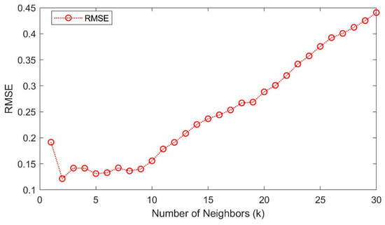 Obtained RMSE for forecasting UCS based on the KNNA for different values of K.