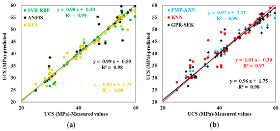 - Yesiloglu-Gultekin, N.; Gokceoglu, C.; Sezer, E.A. Prediction of uniaxial compressive strength of granitic rocks by various nonlinear tools and comparison of their performances. Int. J. Rock Mech. Min. Sci. 2013, 62, 113–122. [Google Scholar] [CrossRef]