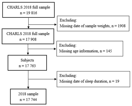 Data from the 2018 China Health and Retirement Longitudinal Study (CHARLS) [23] were used to investigate the association between sleep duration and depression. As an ongoing national longitudinal study among Chinese adults aged 45 years and above, the CHARLS collects an excellent nationwide sample to represent the middle-aged and older adults in China. Starting in 2011 with 17,708 respondents in 150 counties or districts and 450 villages or urban communities throughout the country, the CHARLS set up three follow-up waves every two or three years in 2013, 2015 and 2018, respectively. Details of the CHARLS can be accessed elsewhere [23]. The CHARLS structured questionnaire conducted face-to-face interviews to assess respondents’ information on demographics, socioeconomic status, and health habits. The current study used the latest CHARLS wave (2018) with 19,816 participants to explore the association between sleep duration and depression, excluding 1908 individuals with missing sample weights, 145 individuals with missing age values, and 19 individuals with missing sleep duration. Figure 1 shows the schematic flow of the study sample.