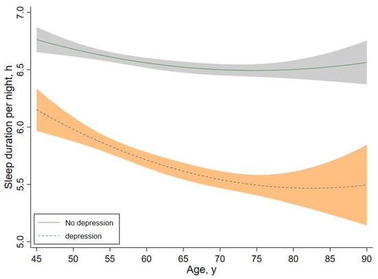 Trajectories for sleep duration across depression groups. Graphs display analog values (lines) of sleep duration with 95% CIs (shaded areas) for depression.